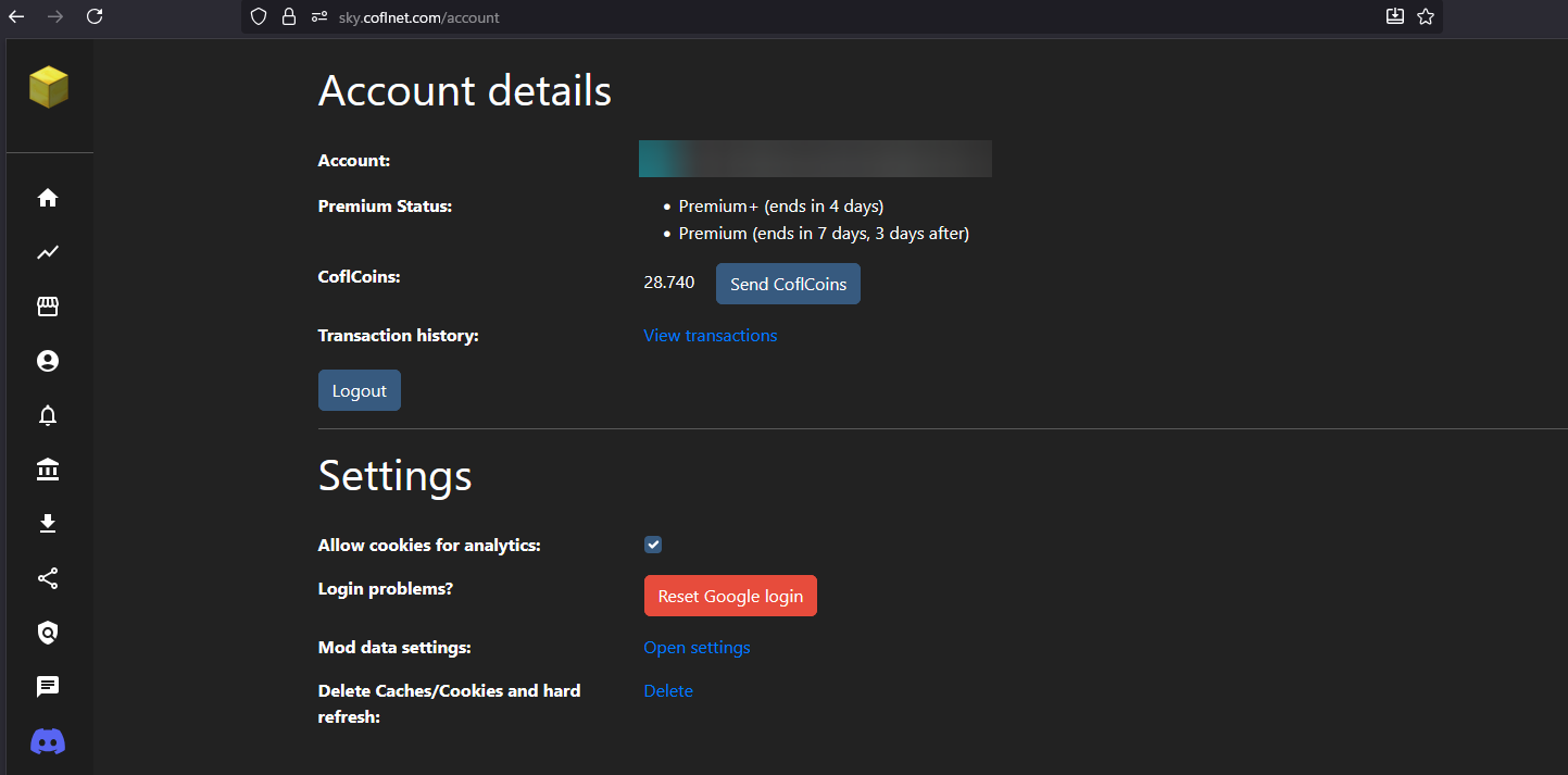 <div align="center" data-full-width="false"><figure><img src="https://2149694626-files.gitbook.io/~/files/v0/b/gitbook-x-prod.appspot.com/o/spaces%2F2z7bhP9EDPLLXHQI8qNM%2Fuploads%2Fgit-blob-78b1fa35aa6d129cb39cc26e3b322f740b36693a%2Fimage.png?alt=media" alt=""><figcaption><p>Go to <a href="https://sky.coflnet.com/?refId=odeO2g">SkyCofl </a>and press on the "Account" tab.</p></figcaption></figure> <figure><img src="https://2149694626-files.gitbook.io/~/files/v0/b/gitbook-x-prod.appspot.com/o/spaces%2F2z7bhP9EDPLLXHQI8qNM%2Fuploads%2Fgit-blob-34639b9eb5d02f7ce2d814da24b195f63395c929%2Ffirefox_VoINhvqDmo.png?alt=media" alt=""><figcaption><p>Log in with your Google account.</p></figcaption></figure></div>